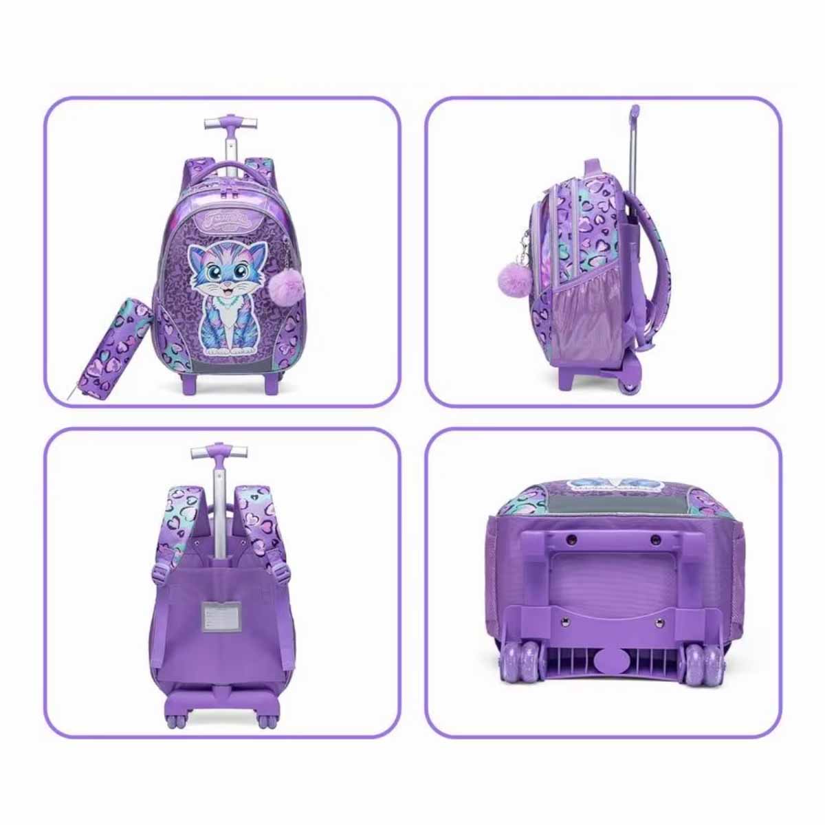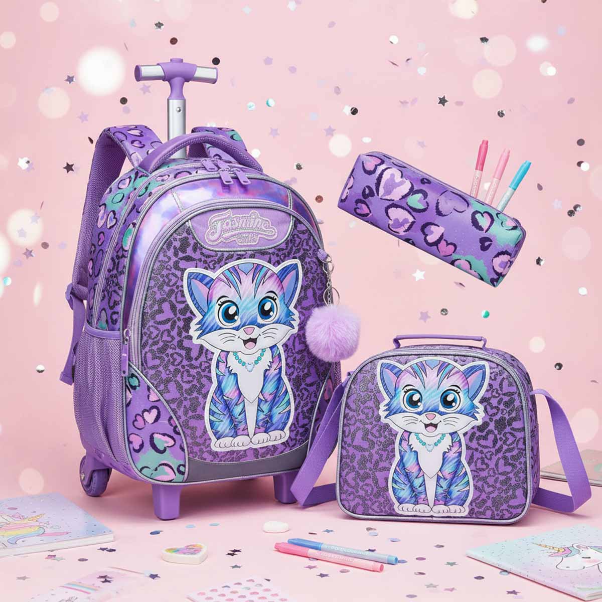 Ce cartable enfant à roulettes thème chat séduit par son design violet pastel, ses détails brillants et son adorable petit chat illustré. Grâce à son système trolley, il permet de soulager le dos de l’enfant en alternant facilement entre portage sur le dos et traction au sol.
