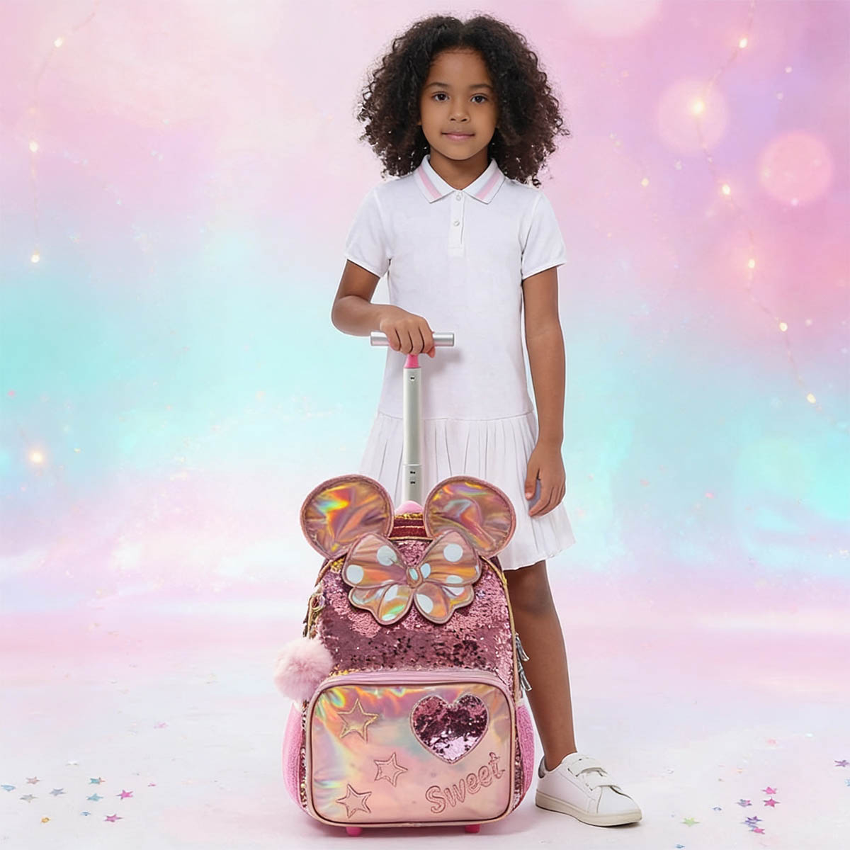 Ce cartable à roulettes holographique combine un design féerique (paillettes, cœurs, étoiles, détails oreilles & nœud) avec une vraie fonctionnalité au quotidien.