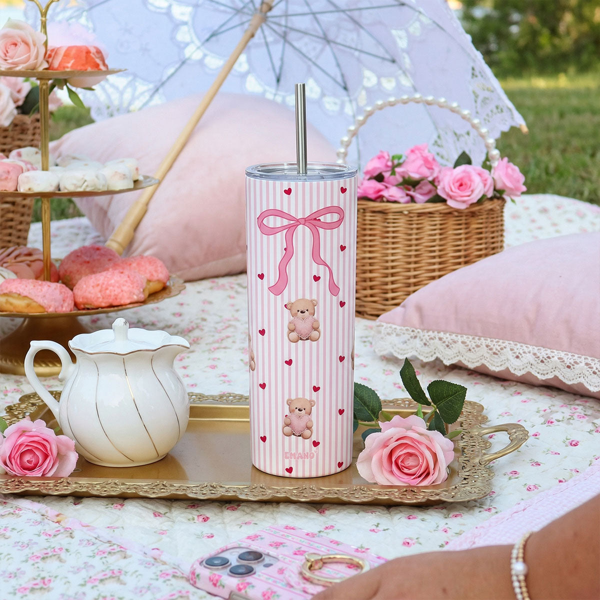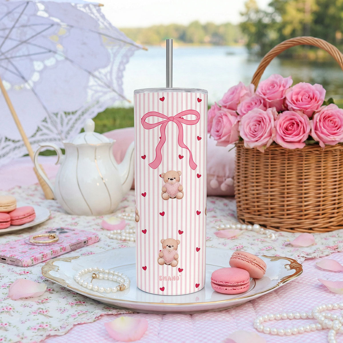 Ses rayures roses, ses petits cœurs, son nœud délicat et ses adorables oursons en font le tumbler parfait à offrir… ou à s’offrir.