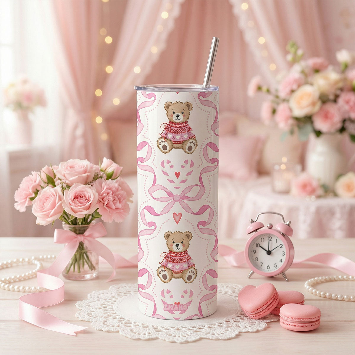 Avec ses adorables oursons en maille rose, ses nœuds délicats et ses motifs cœur, ce tumbler EMANO est pensé comme un vrai accessoire lifestyle : pratique, tendance et irrésistiblement cute.