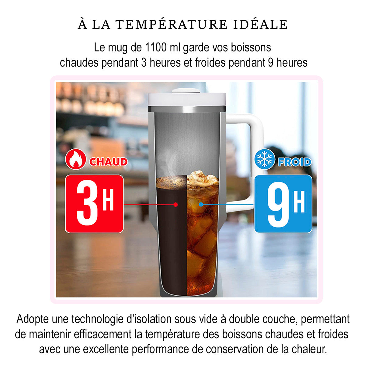 • Garde vos boissons chaudes pendant 7 heures et froides pendant 11 heures.