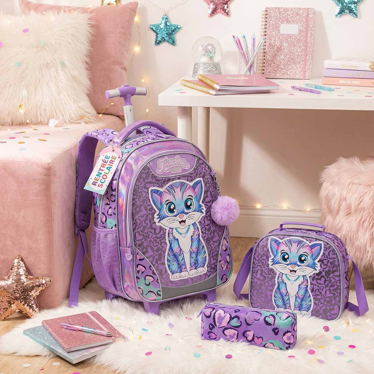 Ce cartable enfant à roulettes thème chat séduit par son design violet pastel, ses détails brillants et son adorable petit chat illustré. Grâce à son système trolley, il permet de soulager le dos de l’enfant en alternant facilement entre portage sur le dos et traction au sol.