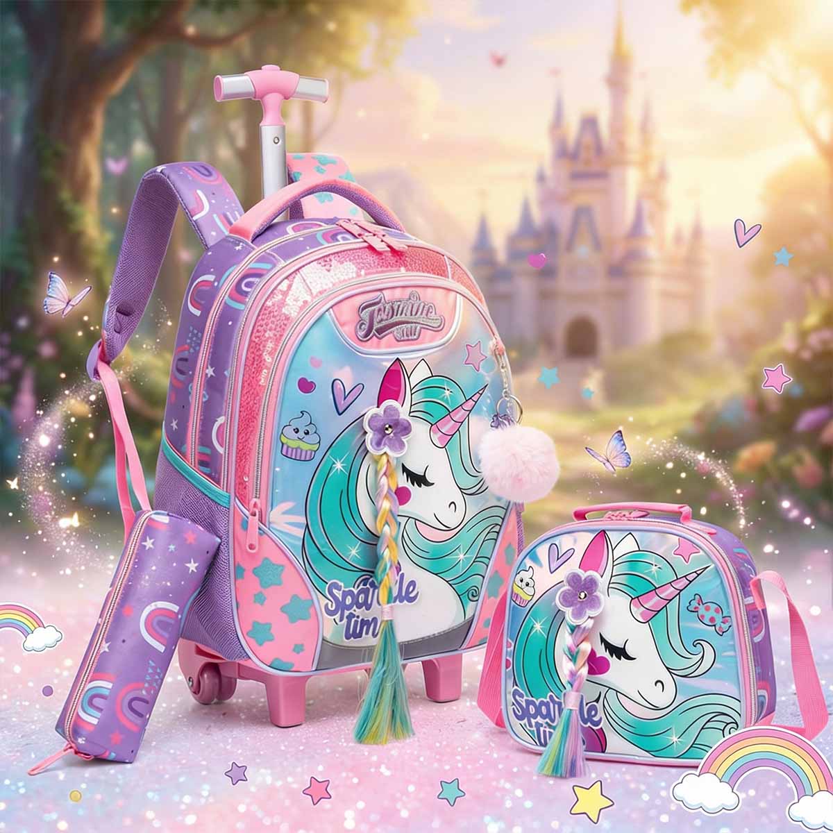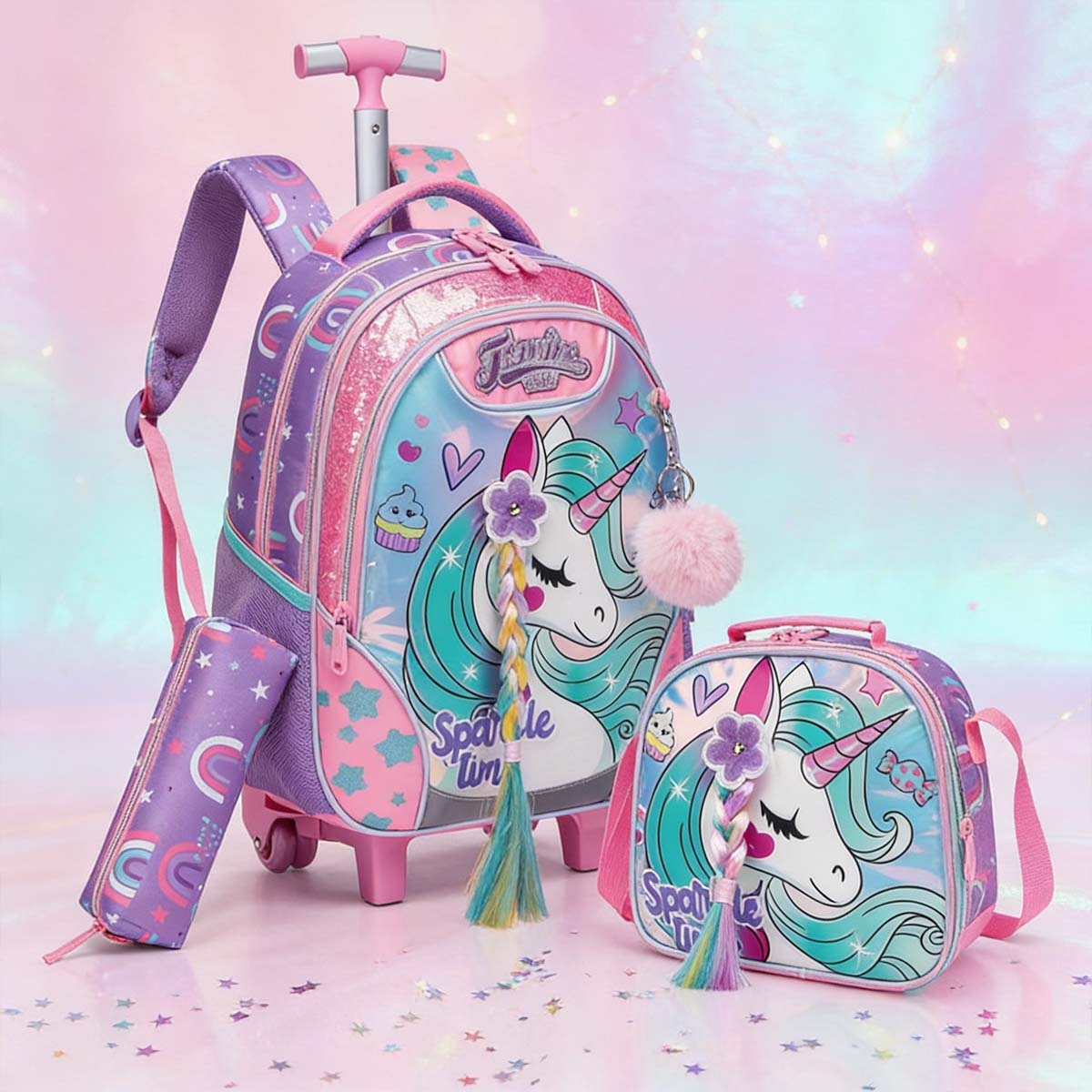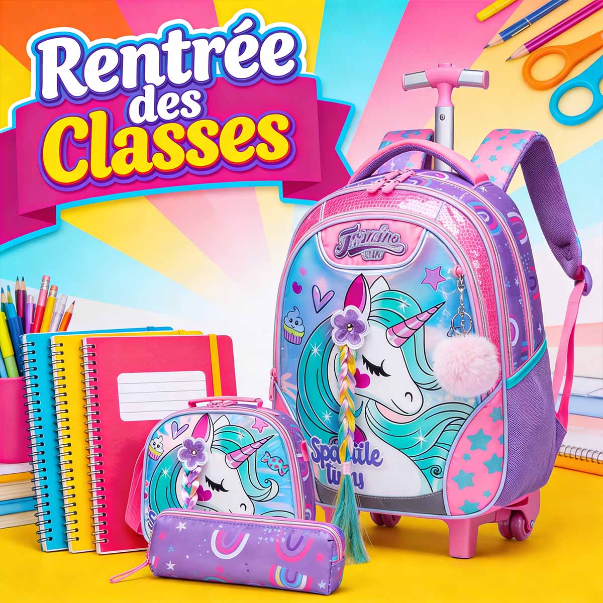 Ensemble cartable licorne à roulettes – Sac + trousse + sac goûter